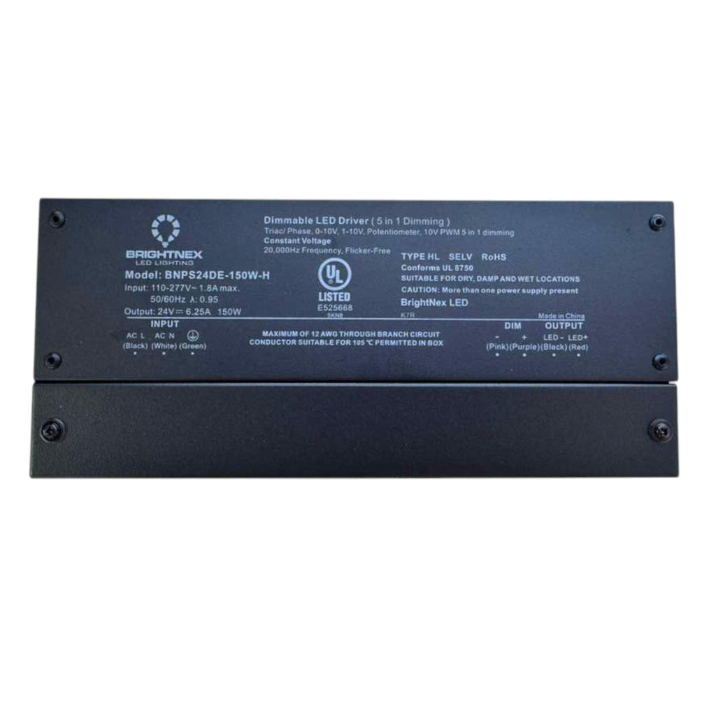 Reliable 150W constant-voltage LED driver with full 5-in-1 dimming support (TRIAC / ELV / MLV / 0–10V / PWM). Offers smooth 0.1–100% dimming, built-in junction box, and UL certification — ideal for LED strips, signage, and architectural lighting projects.