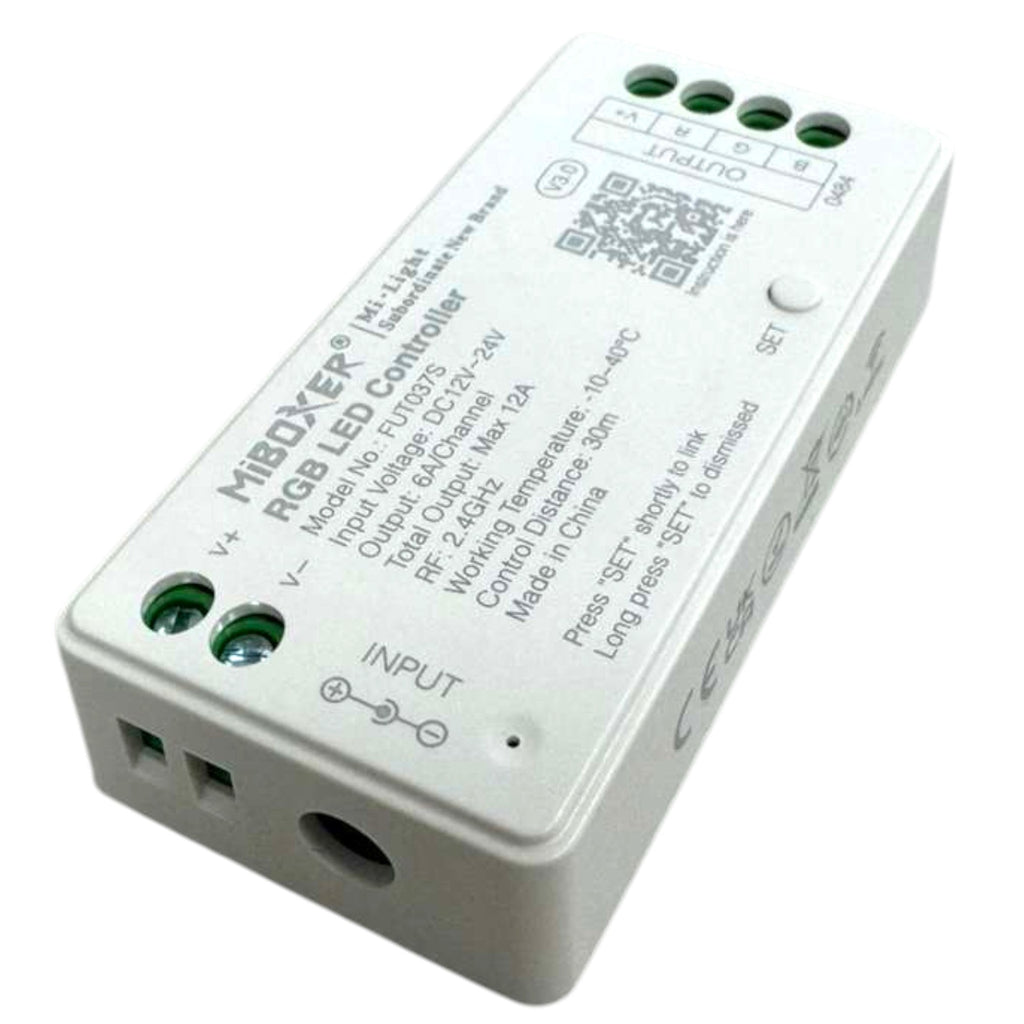 The MiBoxer FUT037S is a high-performance RGB LED controller built for seamless wireless control using 2.4GHz RF. Designed for both residential and commercial installations, it supports smooth RGB channel control, works with multiple MiBoxer remotes, and delivers stable long-range performance.